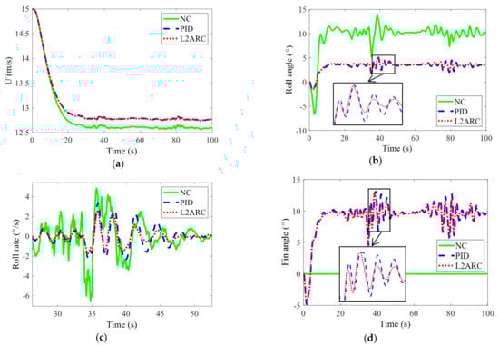 Simulation results of L2-gain adaptive robust control under wave disturbance. (a) Ship speed; (b) roll angle; (c) roll rate; (d) fin angle.