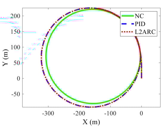 It can be seen from Figure 5 that both the designed L2-gain based adaptive robust controller (L2ARC) and a well-tuned PID controller can effectively reduce the heel and roll motion during ship turns. It can be seen from Figure 5a that the sailing speed of the ship under the action of the controller is slightly increased than that without control, from 12.6 m/s to 12.8 m/s. From Figure 5b,c, it can be seen that the roll and heel reduction control effect of the designed L2ARC is slightly better than a well-tuned PID controller, which shows the superiority of the proposed control strategy. The steady outward heel angle with L2ARC is reduced from 10.19° to 3.01°, and the heel reduction effect can be easily calculated to be about 70.5%. The mean square value of the roll angle during the steady turning phase is reduced from 1.26° to 0.52°, and the roll reduction effect can be easily calculated to be 58.7%. As the encounter angle changes continuously with the progress of the turning, so that the amplitude of the roll motion of the ship also changes periodically. The ship roll is more severe when the encounter angle is 90° or 270°, while other angles are gentler. The control effect of the two controllers is almost the same when the roll is small, but the control effect of L2ARC is better than that of the PID when the roll is large, which is more obvious in Figure 5c. It can be seen from Figure 5d that the fin angle under the action of L2ARC is significant smaller than that under the action of PID. The movement of the fins in the steady turning phase is reduced by approximately 10%, which means the reduction of energy consumption and the effectiveness of the designed L2ARC. The overall effect of the designed L2-gain based adaptive controller is slightly better than well-tuned PID control. In addition, due to the opposite effect of the fin stabilizer on the steady outward heel and turning diameter, the steady turning diameter increases by about 15 m compared with the situation without control, as shown in Figure 6. The simulation results show that the designed controller has good robustness against uncertainties caused by a speed reduction of turning and internal and external disturbance.