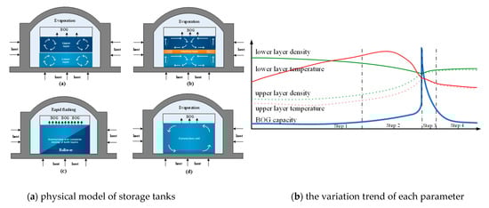 Schematic diagram of LNG from stratification to rollover in tanks: (a) physical model of storage tanks; (b) the variation trend of each parameter.
