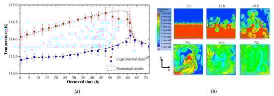 Before the numerical simulations, the model validation was carried out and compared with the experimental data reported by Bates et al. [27], and those rollover experiments were conducted by several gas companies. These data include LNG temperature and density measurement in the tanks under different stratification conditions. According to the survey, the reported accuracy of the experimental data was about 1.2% to 7.2% based on the inaccuracy of the temperature and density measuring equipment. The data error during the stratification to rollover is small, and the data error measured during the rollover is large. This was due to the immaturity and high-cost of the transient measurement technology at the time, and the average value of the process was used to record the dynamic rollover state during data measurement. As shown in Figure 2, using numerical simulation to re-implement the experimental and operating conditions, the temperature distribution in the numerical simulation is a good way to summarize the experimental results and visualize from the stratification to rollover in tanks. The experiment and simulation describe that the fluid in the storage tank due to the heat leakage at the bottom is first of high-temperature in the lower layer and low-temperature in the upper layer. Under the action of gravity and thermal convection, it gradually evolves and finally rolls over. The results show that the numerical calculation results are compared with the experimental data in the literature, and the changes in temperature are similar, and the difference between the calculated values and the experimental values is not more than 6.8%. The surface of the LNG will continuously evaporate due to heat leakage in the storage tank, thus changing its original composition, density and temperature. Both the lower and upper temperatures are slowly rising. This process is called LNG stratification, which is where the verification process is started. Under the influence of heat leakage from the bottom, the liquid in the lower layer of the storage tank is evaporated through the layered upper surface partition. With heat transfer and convection, the lower layers gradually become overheated, and the density of the lower layers continues to decrease. The bottom layer temperature rapidly rises to a maximum value and then drops. The lower layer of liquid penetrates slowly but steadily into the upper layer based on the different densities of the upper and lower layers. All accumulated superheat in the lower layer is released from the free surface by evaporation, resulting in rapid mixing of the lower and upper layers (12–48 h). The drastic change in parameters during this time is the biggest challenge for LNG storage tanks, which is called LNG rollover (48–60 h). Finally, the LNG in the tank reached a new uniform equilibrium in temperature and density.