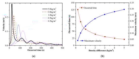 The variation of density difference occurred at time and velocity on the rollover process. (a) Density difference effect; (b) occurred time and velocity.