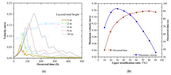 The variation of layered total height, the upper layered ratio on the rollover process. (a) Layered total height; (b) occurred time and the upper layered ratio.
