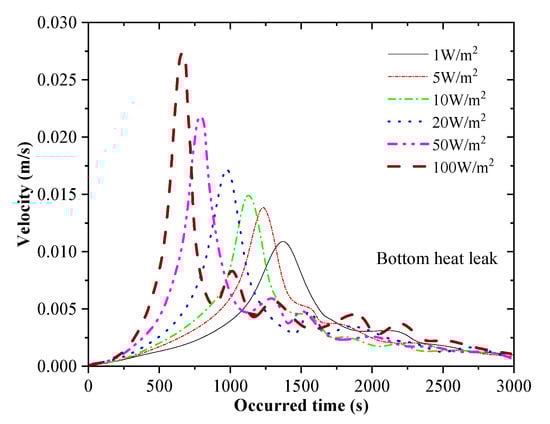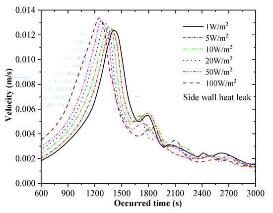 The temperature difference between the bottom and the outer wall of the LNG cryogenic storage tank relative to the liquid in the tank is relatively large, which is much larger than the temperature fluctuation of the outdoor environment, and the influence of outdoor air temperature fluctuation can be ignored. The heat transfer form of the bottom of the storage tank and the wall of the storage tank is mainly that the heat is transferred to the internal tank through the outer tank and the cold insulation material in the form of heat conduction. Therefore, by assuming a fixed heat flux, a study was conducted on the effects of heat leakage from the bottom and wall facing the tank on the rollover process. Figure 5 and Figure 6 show the results of different heat leakage conditions in the case of heat leakage from the bottom of the storage tank and heat leakage from the outer wall surface of the storage tank. With the increase of the heat leakage at the bottom, the velocity increases during the rollover, and the tumbling time decreases. Under different heat leakage from the sidewall, the maximum velocity and time of rollover do not change much. In the case of a small amount of heat leakage, the time difference between the bottom leakage heat and the sidewall leakage caused by the rollover is not too much, but the rolling velocity is different. With the increase of the heat leakage, the influence of the sidewall heat leakage, on the whole, is getting smaller and smaller; the time and severity of the rollover are mainly affected by the bottom heat leakage.