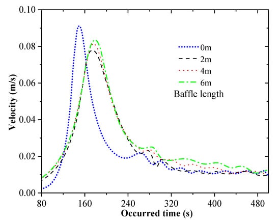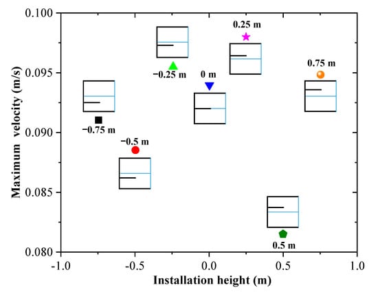 Figure 9 shows the effect of the installation position of the baffles on the liquid rollover process in the storage tank. The middle position of the upper and lower layer was set to 0 installation height, and 8 cases from −0.75 m to 0.75 m were calculated. The figure represents the installation scheme and position, and it can be concluded that the rollover time of the baffle at different installation heights is approximately equal, which indicates that different installation heights have little effect on the time of the rollover. Moreover, the maximum velocity corresponding to several structures is different. The maximum velocity corresponding to the baffles when the installation height is 0.5 m is the smallest.