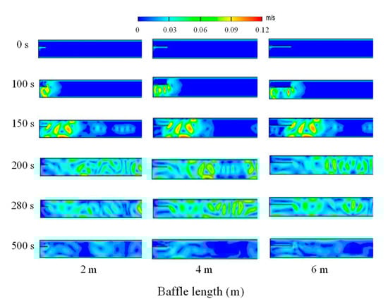 Figure 7 and Figure 8 show the baffle length and velocity distribution of the model with the baffles structure. It can be seen that small vortex mixing occurs first, which increases the liquid velocity and causes disturbances between layers. Due to the influence of the baffle, the tumbling vortex at the tank wall began to disturb the nearby liquid and developed toward the center. As the center vortex increased, the number of vortexes increased, and vortices appeared inside the liquid. During the tumbling process, the speed is gradually increasing, and the mixing and agitation between the upper and lower layers are vigorously ongoing. Finally, the entire flow field started to stabilize, and the liquid mixing speed became slower and slower.