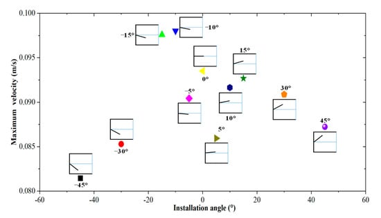 Finally, the suppression effect of the installation angle of the baffle on the rollover is studied, which is reflected in the time when the maximum velocity is reached and the start time, as shown in Figure 10. The model set a 0-degree angle with the parallel upper and lower boundary lines as the installation and stipulated that the installation angle of the partition counterclockwise was positive; otherwise, it was negative. The results are calculated under 11 conditions from −45 degrees to 45 degrees. Under different installation angles of the baffles, the occurrence time of the rollover in the storage tank is generally the same, but the corresponding maximum velocity is different, which means that the different angles have a certain inhibitory effect on the violent rollover in the storage tank. Moreover, the larger the installation angle, the larger the consumables of the baffles are, and it is not easy to fix. Finally, under various conditions, it is believed that under the installation condition of +5°, it can effectively suppress the severity of rolling and reduce consumables.