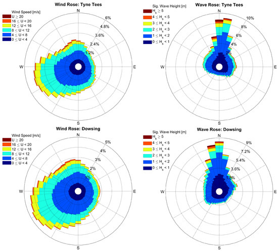 For each site, wind and wave roses were produced in order to obtain a better understanding of the wind and wave climate. Data from coastDat-1 was used. The wind rose consists of the 10-m wind speed and wind direction, and the wave rose consists of and wave direction. Figure 3 shows the wind and wave roses for Ölands Södra Grund and Väderöarna, and Figure 4 shows the corresponding roses for Tyne Tees and Dowsing. It is seen for Ölands Södra Grund and Väderöarna that the dominant wind direction is similar to the dominant wave direction. This is not the case for Tyne Tees and Dowsing, which indicates a more complicated wave climate, e.g., due to swell waves, shape of the coastline, etc. More specifically, at Ölands Södra Grund and Väderöarna the wind and wave direction differed by most 30° during 79% and 74% of the time, respectively. At Tyne Tees and Dowsing the corresponding numbers were 52% and 62%, which again indicates a more complicated wave climate for these two sites.