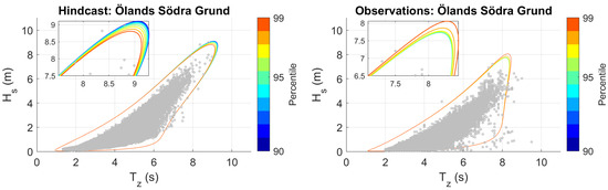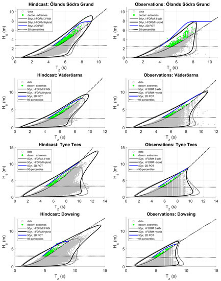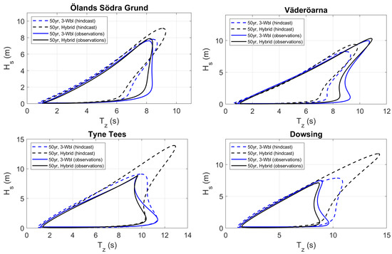 For Ölands Södra Grund and Väderöarna, it was found that the observations and hindcast data both produced reasonably similar contours; however, the maximum value of did not generally agree (Figure 12 and Table 2). For Tyne Tees and Dowsing, the two sites in the North Sea, the hindcast data tended to overestimate the sea states with high , resulting in quite different contours for the highest values of for the I-FORM with the hybrid fit. If one instead considered the more traditional I-FORM with a three-parameter Weibull fit for , the maximum along the contours for observations and hindcast data were similar for Tyne Tees and Dowsing. This is an indication that the bulk of the data is represented reasonably well by the model at these two locations, whereas the extremes (high ) are not, which is a known issue for this hindcast data [36]. As noted in Section 1, Neary et al. [30] reported, on the other hand, a hindcast underestimation of sea states with high along the environmental contours for their study sites. However, differences in wave climate, hindcast models, and contour method makes a direct comparison difficult.