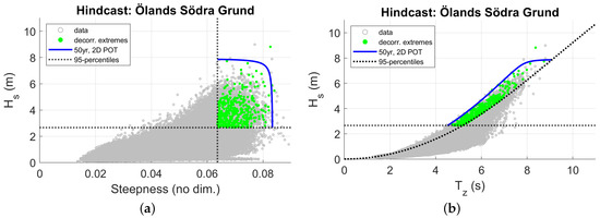 Figure 8 shows the implementation of the 2D POT method for the hindcast data at Ölands Södra Grund. In Figure 8a, the original data in the -plane has been transformed to the -plane, where s is the steepness. Both thresholds are shown, as are the decorrelated events which are used to estimate the 2D joint probability distribution. The 50-year return level curve has been computed, note that it is only drawn in the region where both thresholds are exceeded. Going back to the -plane, Figure 8b shows the same 50-year return level curve and thresholds.