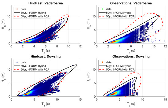 The contours for the I-FORM with PCA are shown in Figure 11 for Väderöarna and Dowsing for both the observations and the hindcast data. Note how the steepness is very large along some parts of the contour for the observations (for a given value of , the steepness increases as decreases). This method generally performed poorly, especially for the observations, with very large maximum steepness along some contours. This is not surprising as it was noted in Section 4.1.2 that the fitting for generally did not perform well. It is important to keep in mind that by changing the fitting function for it is expected that a better fit could be obtained, and thus more sensible environmental contours could be acquired. The main issues with the contours were that the dependency was not properly captured and that the sea states with the highest were not reflected by the contour in a reasonable way.