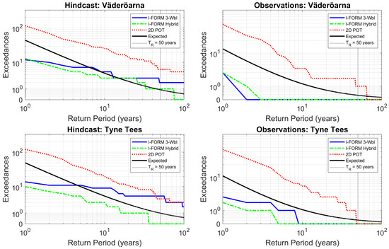 The 2D POT method is interesting to compare with the various I-FORM methods as it differs fundamentally from such methods in several aspects: (1) it is only based on a subset of the data which only contains extreme events, (2) it only uses statistically independent events from the original data (the autocorrelation has been reduced/removed), and (3) it models the dependency between and using (2-dimensional) copulas rather than using conditional fitting of 1-dimensional distributions. One obvious drawback of the 2D POT method is that its return levels are only valid above both thresholds, and thus any comparison can only be made in this region of the -plane. However, even in this region the different methods are not expected to match perfectly as there are many different mathematical definitions of return level curves in two dimensions and they typically yield different contours (see, e.g., in [60], and also in [59]). Despite this, it is still interesting to investigate if the different methods yield similar contours.