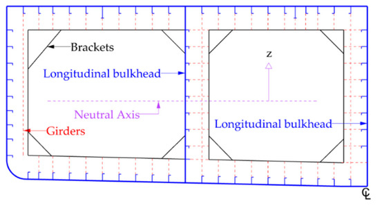 Figure 2 depicts the transversal view of the half of midship section, which includes the longitudinal members highlighted in blue color. All the continuous longitudinal structural members of the midship section are considered to determine the moment of inertia and section modulus. The distance z of the midship section is measured from its neutral axis to the top of the keel and the top line of the strength deck. Commonly, the longitudinal members of the hull section modulus are extending through the midship section and towards the ends of ship. The minimum section modulus (Zmin) of the midship section of the hull with respect to transversal neutral axis, on the deck or on the keel (ZB and ZD), is obtained by [6]: