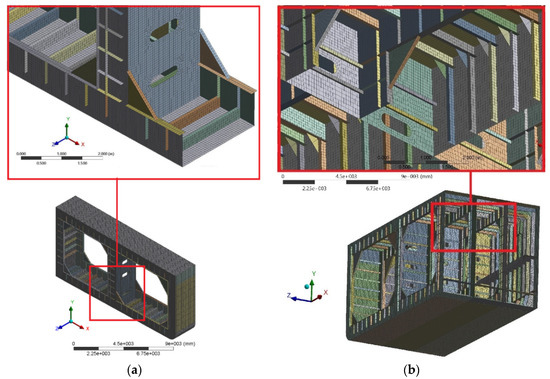 Mesh between two transversal frames of the FEM model of the barge midship section: (a) bottom plate, longitudinal bulkhead and bracket, and (b) main deck and longitudinal bulkhead.