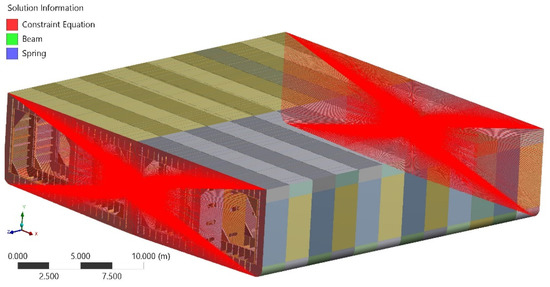 Figure 7 depicts a FEM model of the barge midship section used for its structural analysis, which was developed using the ANSYS 2017 Workbench software. This model included the cargo tanks with their longitudinal hull structural elements previously verified with Lloyd’s Register rules. In addition, the FEM model considered the port and starboard sides of the tanks, overall depth and transversal frames at the ends. Furthermore, this model added the internal structure (grade A36, tensile stress 400 MPa) of the midship section formed by the transversal bulkheads, longitudinal bulkheads in the tanks and all main longitudinal and transverse structural elements.