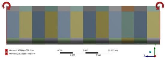 The total vertical bending moments calculated with (18) were applied to the FEM model using multipoint constraints (MPCs) in ANSYS software for sagging and hogging conditions. The MPCs allow the connection of different nodes and degrees of freedom together for the FEM analysis. Figure 9 illustrates these MPCs used in the two ends of the midship section to apply the bending moments. Figure 10 shows the direction of the total vertical bending moment for sagging condition using the IACS convection signs [18]. The value of the total vertical bending moment (906.88 × 106 Nm) was applied in all the longitudinal stiffeners and hull located in the ends of the FEM model.
