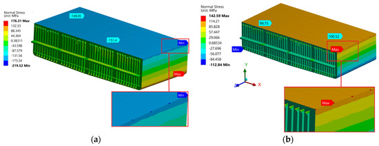 Normal stress distribution in z direction of the central tank generated by: (a) Sagging bending moment of 906.88 × 106 Nm and (b) Hogging bending moment of 599.10 × 106 Nm.