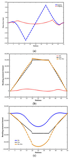 The shear forces and bending moments in still water along barge were calculated with (10) and (11). Figure 12 depicts the distribution of the shear forces and bending moments regarding the sagging and hogging conditions. The most critical condition was sagging due to the location of the load near the midship section. In addition, the wave bending moment was calculated with (15) and it is plotted using black line, and the total bending moment is obtained with (18) and it is illustrated with orange line (see Figure 12b,c). The total calculated sagging and hogging bending moments were 906.88 × 106 Nm and 599.10 × 106 Nm, respectively.