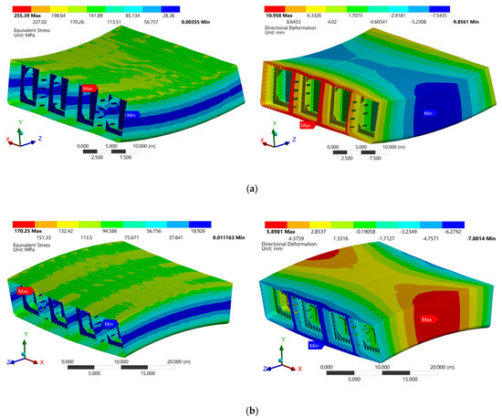 Results of von Mises stresses (left) and displacements (right) of the FEM model of barge midship section considering (a) sagging bending moment of 906.88 × 106 Nm and (b) hogging bending moment of 599.10 × 106 Nm.