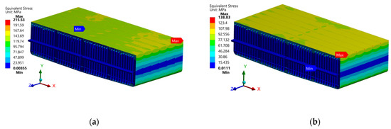 Results of von Mises stress distribution of the central tank generated by: (a) Sagging bending moment of 906.88 × 106 Nm and (b) Hogging bending moment of 599.10 × 106 Nm.