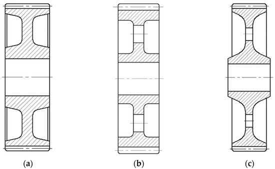 The gearing of the cast gear wheels had the number of teeth z = 71, the normalized value of the modulus mn = 7 mm, and a gear width of b = 150 mm. The problem was solved for spur gear wheels. The deformation was investigated for the wheel models listed in Table 5. The magnitude of the width load, w = 100 N/mm, was expressed on the basis of a single force, F = 15,000 N.
