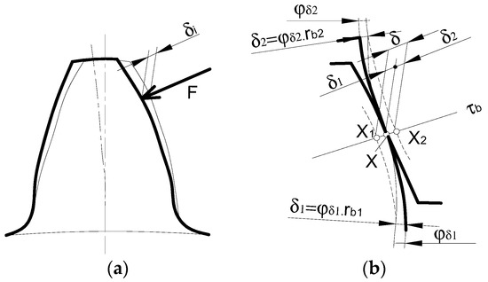 However, in reality, it is necessary to determine the deformation of the interlocking teeth, i.e., the deformation of a pair of teeth, which can be imagined and illustrated in Figure 2b. This figure shows a section of a pair of teeth, which touch at the point X on a line of action τb in the unloaded state. After loading, the profiles of the two teeth engaging together deformed into the shape shown by the dashed line in the respective figure. These already deformed tooth profiles intersected the line of action at points X1 and X2. The total deformation of this pair of teeth δ could then be determined as the sum of the deformations of both teeth δ1 and δ2. There are the angles φδ1 and φδ2 shown in Figure 2. These are the angles by which the individual wheels must turn to meet again at point X, as is in fact the case.