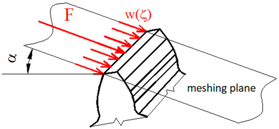 The teeth of the gears are deformed by the load. Under the action of the resulting normal force F, the tooth of one wheel is deformed, as illustrated by a thick line in Figure 2. The resulting deformation of the tooth in the direction of the normal force δi (i = 1,2—index, which distinguishes whether it is a pinion tooth, drive wheel or a driven wheel tooth) consists of a deformation from bending, shearing, the deformation at the point of entry and from tactile deformation [14].