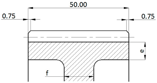 In the next part, the influence of the rim thickness on the tooth deformation was investigated. Several spur gear models were created, where the web thickness was the same for all models (value of f = 15 mm) and the rim thicknesses varied (see Figure 5). Since the deformation along the tooth width was not constant beyond the deformation value that represented the tooth deformation, the deformation at the center of the tooth width was defined. Figure 7 shows the dependence of the tooth deformation on the thickness of the rim. As the results show, reducing the thickness of the rim increased the deformation of the teeth.