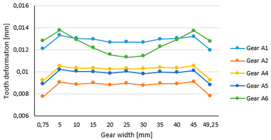Figure 5 and Figure 6 shows the distribution of deformation across the width of the tooth when a load is applied to the addendum of the tooth for individual models of forged gear wheel shapes. As can be seen from the figure, the distribution of the deformation along the gear width was comparatively the same for all the examined shapes of the forged gear bodies. An exception is the A6 model (see Table 2), whose rim thickness is the smallest. For the model A6, the thickness of the rim is equal to 1.8 mn, which is much less than the permissible minimum thickness of the rim (3.5 mn). Therefore, the tooth deformation reflects the effect of a web with a thickness equal to f = 0.3 b = 15 mm located in the middle of the width of the wheel. At the location of the web, the deformation of the tooth decreased due to the supporting material of the web. The tooth deformation for model A1 was higher than for models A2 to A5, because the thickness of the rim was slightly greater than the minimum rim thickness defined by the standard value.