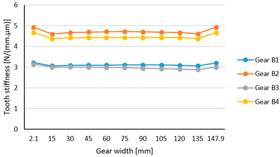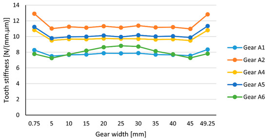 Figure 9 shows the effect of the rim width on gear stiffness. As the thickness of the rim increased, the rigidity of the gearing also increased. The thickness of the rim was of a lesser value than the 3.5 mn and affected the stiffness of the gearing more significantly; therefore, it was appropriate to choose the thickness of the rim equal to or greater than this value. For the A6 model, the thickness of the rim was equal to 1.8 mn, which was much lower than the permissible minimum thickness of the rim (3.5 mn). Therefore, the stiffness of the tooth reflected the effect of a web of size f = 0.3 mn = 15 mm located in the middle of the wheel width. At the location of the web, the stiffness of the tooth increased due to the supporting material of the web, unlike other models, where the thickness of the rim is greater than the allowed minimum.