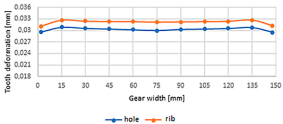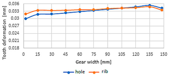 A mutual comparison of the deformation along the width of the tooth for models of cast spur gears is shown in Figure 15 if the tooth is placed above the hole, and in Figure 16 if the tooth is placed above the rib.