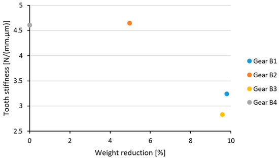 Figure 18 is a comparison of the effect of weight loss on gear stiffness for cast spur gears. Wheel B4 was chosen as a wheel with zero mass loss, because its weight was the largest of the proposed models. However, the B4 wheel weighed 50.5% less than a full solid-body gear wheel. From Figure 18 it was determined that the gearing stiffness decreased with an increase in material loss. The exception was the B3 wheel due to its shape. Gear wheels B1 and B3 had the highest mass reduction, but their gear stiffnesses were smaller compared to wheels B2 and B4. The wheels B2 and B4 had almost the same amount of gear stiffness, but the wheel B2 had a greater mass reduction, which was more advantageous in terms of weight. Due to its having the highest gear stiffness and a relatively good weight, wheel B2 is the most advantageous.