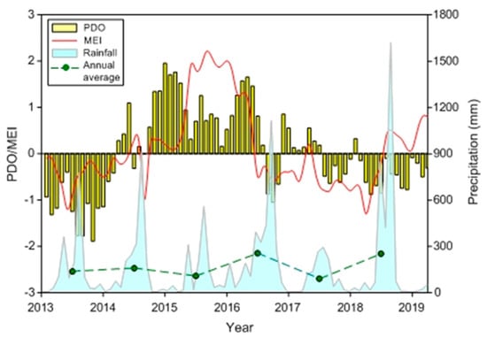 Time series of the Pacific Decadal Oscillation (PDO), Multivariate ENSO Index (MEI), and precipitation during 2013–2019. Data are based on monthly average for PDO and MEI and monthly accumulation and annual average for rainfall (rainfall data from Central Weather Bureau of the Republic of China).