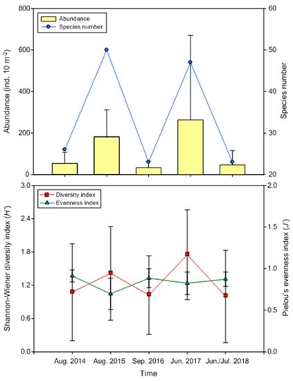 The variation patterns of the species number and Shannon-Wiener diversity index consist with abundance (Figure 4). Significant interannual difference was found in species number (ANOVA, F = 5.308, p < 0.01), but not in Shannon-Wiener diversity index (ANOVA, F = 1.822, p = 0.139). The number of species was greater in 2015 (50) and 2017 (47) than in 2014 (26), 2016 (23), and 2018 (23). Both species number and Shannon-Wiener diversity index, in general, increased with increasing distance from the shore, most likely due to the bottom depth. The interannual variation in Pielou’s evenness index showed an opposite trend to those of species number and Shannon-Wiener diversity index (Figure 4), with lower mean values in 2015 and 2017. Similarly, higher values of Pielou’s evenness index were observed in the offshore stations. There was a significant difference in Pielou’s evenness index among years (ANOVA, F = 4.035, p < 0.01).