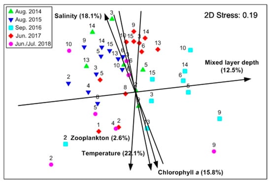 In order to observe the temporal difference in the assemblage structure of summer mesopelagic fish larvae, multivariate analyses were performed with the PRIMER-6 software package (PRIMER-E, West Hoe, Plymouth, UK). Data on larval abundance were log(x + 1)-transformed to reduce the weighting of the dominant species. Similarity matrices of abundance of mesopelagic fish larvae in each sampling time were constructed using the Bray-Curtis Index [47]. These matrices were then employed to create a hierarchical agglomerative clustering using complete linkage to delineate groups with distinct community structure. In addition, non-metric multi-dimensional scaling (nMDS) [48] was also used to provide a two-dimensional visual representation of assemblage structure. Only 13 taxa with more than 1% of the total catch were included in the analysis avoiding any undue influence of rare species. Ordination scores produced by the nMDS were compared to local environmental variables (temperature, salinity, mixed layer depth, chlorophyll a, and zooplankton) using multiple regression analysis in order to determine which variables were significantly related to the larval assemblage structure [48,49]. In the regression analysis, the nMDS scores were treated as the independent variables and each environmental variable as the dependent variable. The rationale for selecting this method is described in Somarakis et al. [50]. Regression lines and their directions were plotted in the nMDS diagram according to Kruscal and Wish [48]. The direction of maximum correlation of each regression line is at an angle φr with the rth nMDS axis. The direction cosine (or regression weight) cr of that angle is given by the following formula: