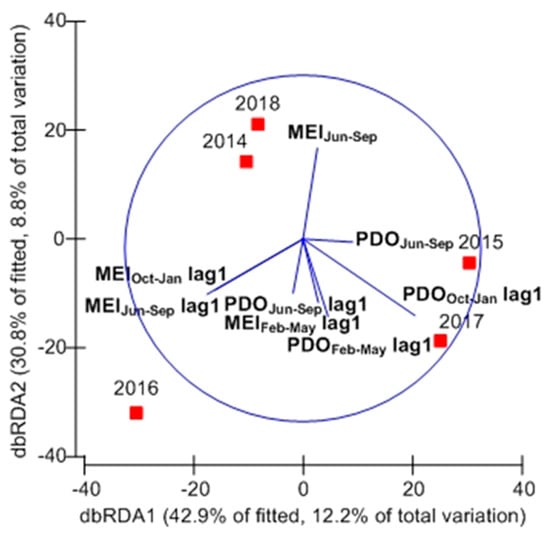 Distance-based redundancy analysis (dbRDA) ordination for the composition of mesopelagic fish larvae constrained by the PDO and MEI indices. PDO: Pacific Decadal Oscillation Index; MEI: Multivariate El Nino-Southern Oscillation Index.