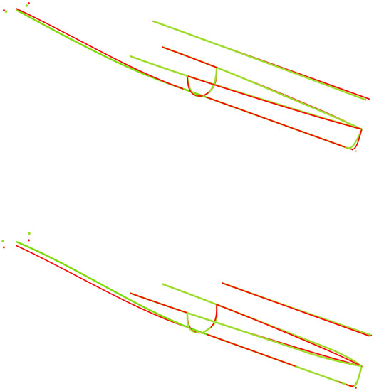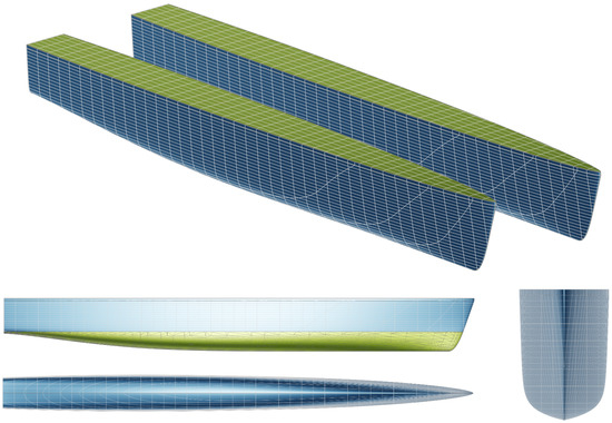 Figure 2 gives an impression for various views, omitting the deck and superstructure. The blue demi-hull illustrates the cat’s port side up to the deck while the green demi-hull shows the underwater portion of the cat’s starboard side cut at design draft. The baseline’s demi-hulls were symmetric with regard to both their centre planes and, naturally, the cat’s mid plane. They neither featured any knuckle lines nor spray rails. No topological changes ought to be introduced during the optimisation campaign, but an asymmetry of the demi-hulls would be acceptable.