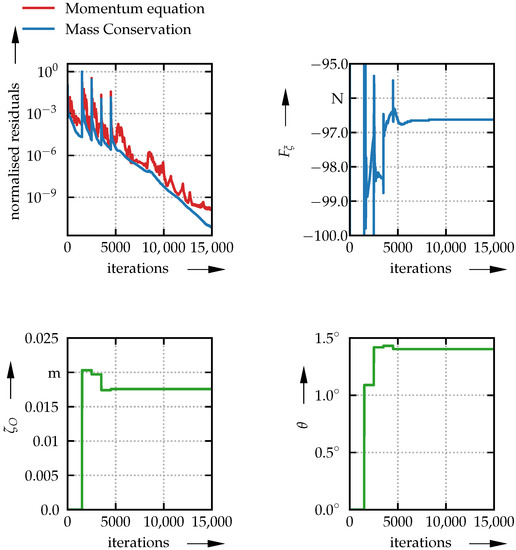 ) along with the residuals. As can be seen, even after the force stabilized, the residuals keep dropping and thus the solution converges. Only very minor changes occur after 8000 steps, so in order to save time, only 8000 iterations are performed during the optimisation study.