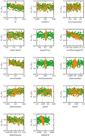 Figure 5. It shows that performance is correlated but that variants do not always yield improvements at both drafts. Both DoEs clearly indicate that a thorough optimisation for calm-water hydrodynamics would have to be multi-objective, including (at least) two speeds, possibly two drafts and the influence of the propulsion system. If a design team has to consider all these aspects, further complemented by non-hydrodynamic aspects, it becomes all the more clear that the number of variants to be investigated needs to be as small as possible when running expensive simulations.