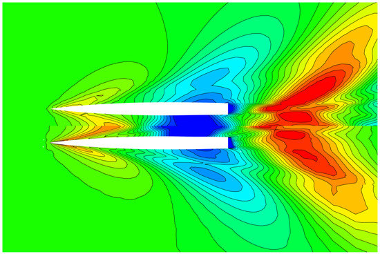 For the cat simulation with free surface, a constant number of 8000 time steps are computed. The non-dimensional time step is chosen at 0.008 and one SIMPLE iteration per timestep is performed. A numerical beach for the damping of waves in the far field is used, for details see [