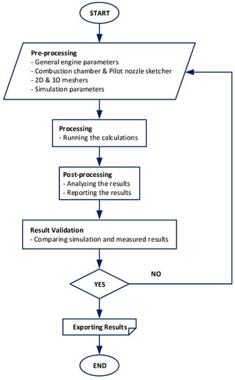 The simulation process included three steps: (1) pre-processing, (2) processing, and (3) post-processing. The first step included declaring general engine parameters, building computational domains, creating movable computational meshes, and setting up the simulation parameters. The solutions were calculated in the second step. In the third step, the simulation results were analyzed and reported. After obtaining the simulation results, the simulation results and measured results were compared for the validation of the simulation models. This process was repeated until the simulation and measured results matched. Figure 2 shows the workflow of the study.