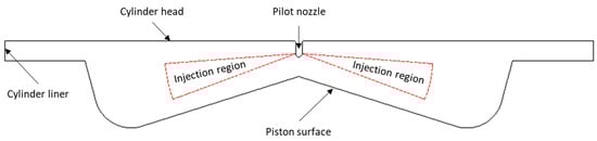 The object of this research was a four-stroke gas-diesel DF marine engine. The effects of various gases when used as the primary fuel on the engine’s in-cylinder pressure, temperature, and emission characteristics in the DF modes compared to those in the diesel mode were analyzed by simulating the combustion process and emission formations occurring in the engine cylinder. A schematic diagram of the simulated engine is shown in Figure 1. The piston surface had a -type shape. The pilot fuel nozzle had 12 identical holes with an injection angle of 155°. Specifications of the simulated engine can be found in our previous publication [50].