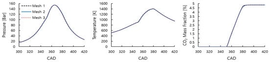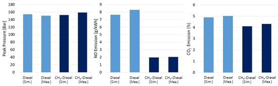 After obtaining the convergence in calculating the solution, we plotted the energy balance to confirm the energy conservation. The energy balance plot showed that the energy balance at the end of the calculations (CAD = 478) in all of the calculation cases was almost equal to zero, confirming that the calculations have gotten energy balances. The simulation results were then verified again by comparing them with the measured results reported in the engine shop test data provided by the engine manufacturer. The comparisons between the simulation and measurement results for the diesel and DF modes are shown in Figure 7. The engine shop test conditions and the tested results are listed in Table 6. The measured and simulated values used for CFD model validation were the in-cylinder peak pressure, the NO and CO2 emissions of the engine running at the full load with a speed of 720 rpm.