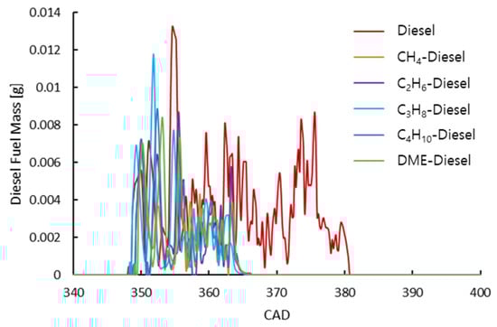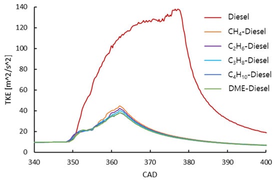 Comparing the DF modes, the results showed that the maximum TKEs reduced in the following order: CH4-, C2H6-, C3H8-, and C4H10-diesel DF modes. In contrast, they were almost the same in the C2H6- and DME-diesel DF modes. This is because, as shown in Figure 9, except the heat release rates, which were almost the same in all combustion cases due to the dominance of the diesel (pilot) fuel premixed combustion in the first stage of combustion, the heat release rates in the second stage of combustion (premixed combustion of the gas-air mixture) of DF modes reduced in the order of CH4-, C2H6-, C3H8-, and C4H10-diesel DF modes. This reduces the maximum TKEs according to the order of CH4-, C2H6-, C3H8-, and C4H10-diesel DF modes, as shown in Figure 9.