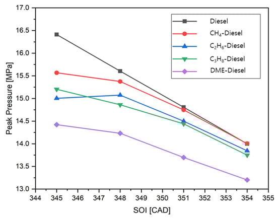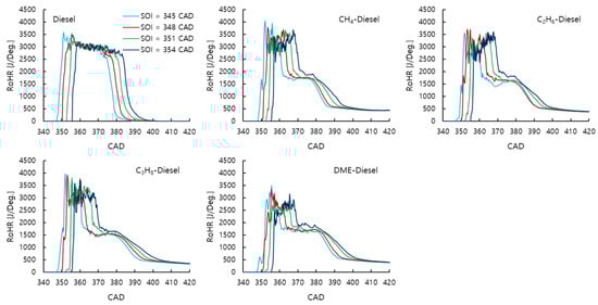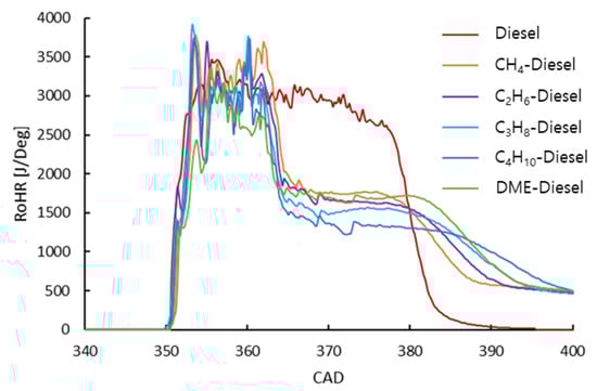 As widely known, RoHR plays a very important role in the in-cylinder pressure rise during the engine combustion process, so analyzing the in-cylinder pressure curve in conjunction with the RoHR traces will give a detailed sight into the thermodynamic characteristics of the combustion process. In this study, the RoHR was calculated by the AVL FIRE ESE Diesel platform, as the same as the method reported by Valentina Fraioli et al. in their contribution [71]. In the first combustion stage of the DF modes, although only a small amount of the diesel pilot fuel is injected into the combustion chamber, the RoHRs in all combustion cases are almost the same, including DF modes and diesel mode. This is because diesel premixed combustion is the main contributor to this combustion stage. In other words, the combustion characteristics in all combustion cases are almost the same in this stage. As soon as the diesel pilot fuel self-ignites to generate ignition sources, the gas-air premixed mixture immediately burns without any ignition delay of the premixed gas fuel. From the second stage of DF combustion, the premixed combustion of the primary fuel (gas) is the main contributor instead of the combustion of the diesel fuel. Figure 9 shows that in the second stage of combustion, the RoHRs of DF combustions are lower than those of diesel combustion and reduce in the order of CH4-, C2H6-, C3H8-, and C4H10-diesel modes. This combustion stage occurs near the TDC, indicating that this stage plays a very important role in the in-cylinder pressure rise rate. Reductions in the RoHR in this combustion stage contribute to the reduction of the in-cylinder peak pressure. Because the RoHR decreases in the order of CH4-, C2H6-, C3H8-, and C4H10-diesel modes, the in-cylinder peak pressure also reduces in the same order, as shown in Figure 10.