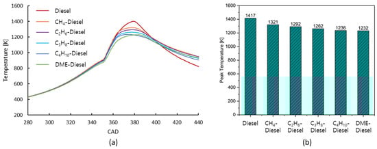 The in-cylinder temperature diagrams and peak temperatures for all cases of combustion are shown in Figure 12. The simulation results showed reductions of 6.75%, 8.82%, 10.94%, 12.77%, and 13.06% in the in-cylinder peak temperature for the CH4-, C2H6-, C3H8-, C4H10-, and DME-diesel DF fuel modes, respectively, compared to the diesel mode.