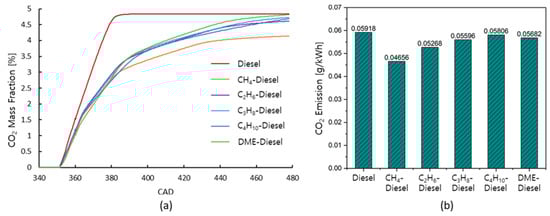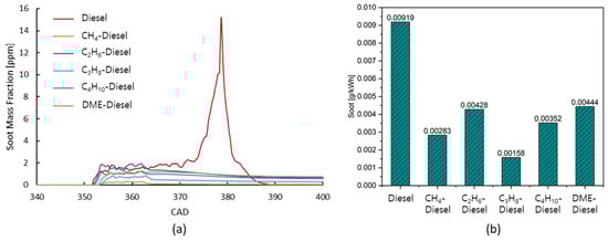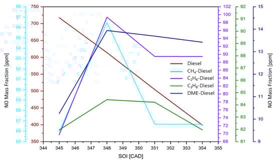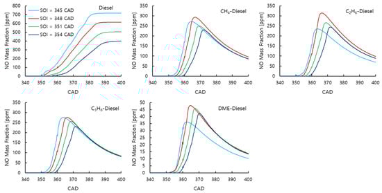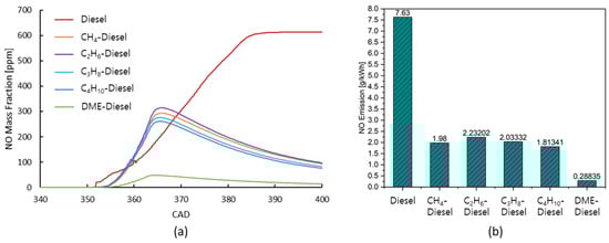 Figure 13 shows the NO emissions generated in all the combustions. Figure 13a shows the mean NO mass fraction in the engine cylinder according to the engine CADs, whereas Figure 13b shows the specific NO emission (g/kWh). The results showed that the NO emissions generated in the DF modes were significantly reduced compared to those in the diesel mode, particularly when DME was used as the primary fuel in DF modes. The NO emissions generated in the diesel, CH4-, C2H6-, C3H8-, C4H10-, and DME-diesel DF modes were 7.63, 1.98, 2.232, 2.033, 1.813, and 0.288 g/kWh, respectively. This means that NO emissions were reduced by up to more than 74.05% and 96.225% when the engine was operated in the CH4- or DME-diesel DF modes, respectively, as shown in Figure 13b.