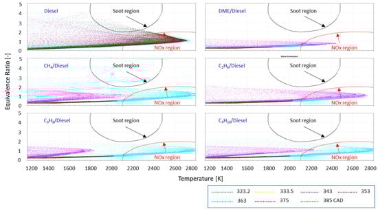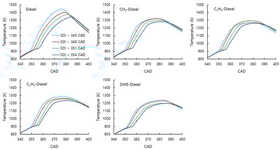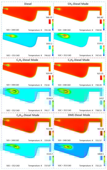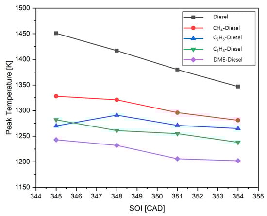 Similar to the reduction in the in-cylinder peak pressure presented in Section 3.2, the lower in-cylinder peak temperature in the DF modes is also due to the lean premixed combustion characteristics and slower burning rate of DF combustion. Two main factors affect the reduction in the in-cylinder temperature in DF modes: (1) the lower RoHRs at the second stage of the combustion and (2) lower compression temperature due to the effects of the higher overall heat capacity of the gas-air premixed mixture at the start of the compression process. The RoHRs in the second stage of the combustion were reduced together with reductions in the compression temperatures in the order of CH4-, C2H6-, C3H8-, C4H10-, and DME-diesel DF modes, which reduced the in-cylinder peak temperature in the same order, as shown in Figure 12.