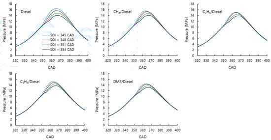 To clearly illustrate the effects of various gas fuels on combustion and emission formations inside the engine cylinder, all the BCs and working conditions of the engine remained unchanged, except for the difference in the fuels to be used; that is, only diesel was used in the diesel mode and gas-diesel was used in the DF mode. In addition, for the purpose of studying the influence of the SOI timings on the combustion and emission formations of the engine, numerous simulations of the combustion by adjusting the SOI timing were performed. In this section, the in-cylinder pressure, temperature, and emissions in all simulation cases are presented and analyzed.