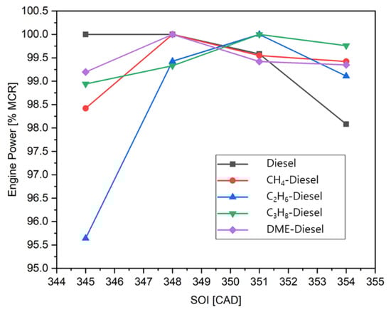 This study successfully analyzed the benefits of using various gas fuels as alternative fuels and the SOI angle adjustment method in DF marine engines to meet the IMO emission regulations without the use of any emission after-treatment devices that were very rare to be found in previous studies. In addition, this study would be a prerequisite for further research on other state-of-the-art dual fuels, such as the methane-hydrogen mixture or ammonia as the primary fuel.