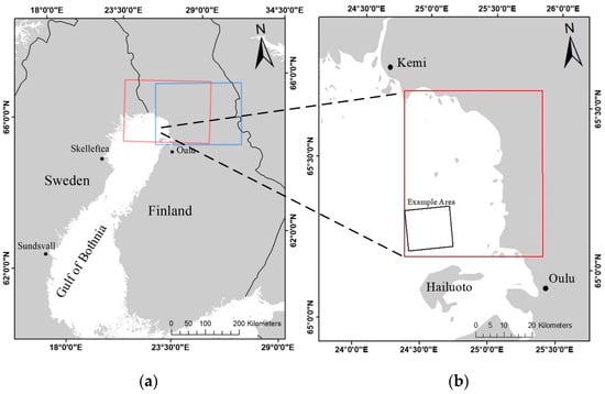 The Baltic Sea, an inland sea in northern Europe, is one of the largest brackish water areas in the world. The sea ice in the Baltic Sea usually occurs in the shallow coastal area of the northernmost part of the Gulf of Bothnia in November each year. Maximum coverage is reached in February or March of the following year [28]. In the Gulf of Bothnian, the average annual fast ice thickness is usually 0.58 ± 0.13 m [29]. Then the sea ice usually lasts until mid-May before melting. Although the seasonal ice cover of the Baltic Sea has many similarities to that of the Polar oceans, it has many unique characteristics, which are mainly caused by the brackish water that forms the ice, resulting in low salinity per unit volume and porosities. In addition, the maximum ice extent in the Baltic Sea varies greatly from year to year because of the milder climate in this area than in the Polar regions. Rainfall and freeze–thaw cycles can occur throughout the winter [30]. As trade increases, there is a growing need for ice transportation in winter. Although landfast ice provides convenience in transportation, it also brings many environmental problems. The interaction between landfast ice and land causes the erosion of the shore and sea bottom [31]. Therefore, it is of great significance to study the local landfast ice to avoid sea ice disasters and serve winter transportation. As shown in Figure 1b, the northeastern coast of the Gulf of Bothnia (24.5–25.5° E, 65.0–65.6° N) located in the northern Baltic Sea is selected as the study area. The characteristics of high latitude and long glacial period here are particularly suitable for the study of landfast ice.